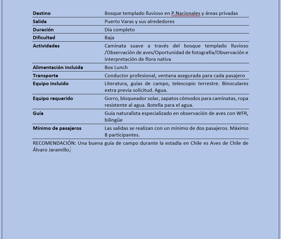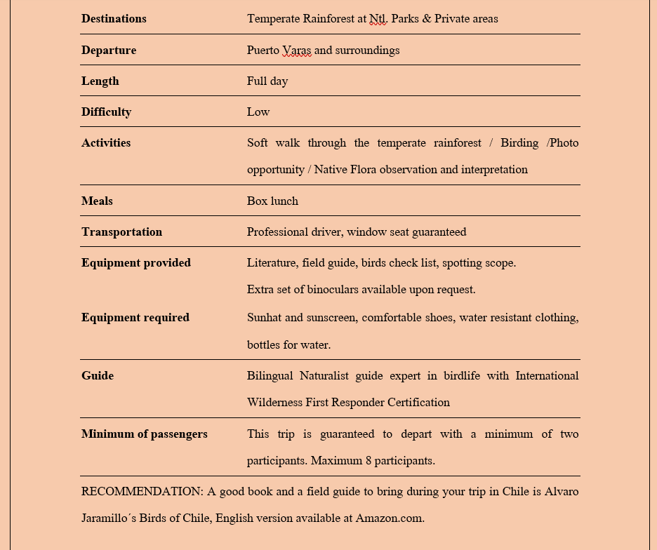 FULL DAY - REGULAR SERVICE - The birding day will be focused on the elusive, tame and cryptic birds that inhabits this unique ecosystem known as the Valdivian Rainforest or Southern Temperate Rainforest. The forest itself is a gem. The exuberant and dense vegetation is home of species that any birder wants to find once visiting the region. On the way back from the park we will also have some time to scan the shore of the Reloncaví fjord looking for waterfowl and shorebirds.