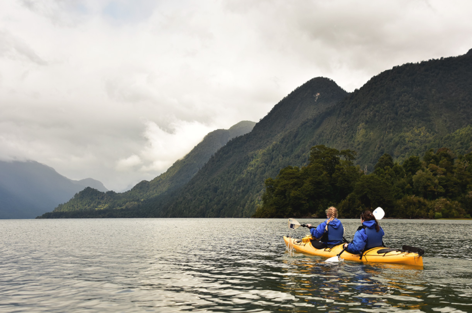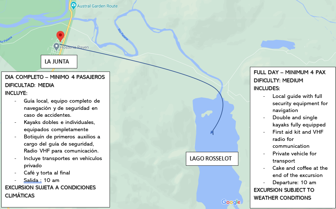 REGULAR GUIDED EXCURSION – MINIMUM 4 PASSENGERS – APROX. 6 HOURS – The starting point is La Junta, from where a vehicle will drive the guests for approximately 10 kilometres to the source of the Rosselot river which is the outflow of the Rosselot Lake. The drive takes the guests upriver and offers splendid views of the Barros Arana range. Before beginning the excursion there is a short security talk. After about one hour of kayak, the excursion continues by foot, walking upriver along one of the streams that flow into the lake, until the Cascada Escondida (Hidden Waterfall) of 50 meters high. The trip back is on kayak all the way to where the vehicle was left. Once in La Junta there is a coffee and cake in one of the local restaurants.