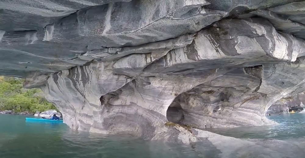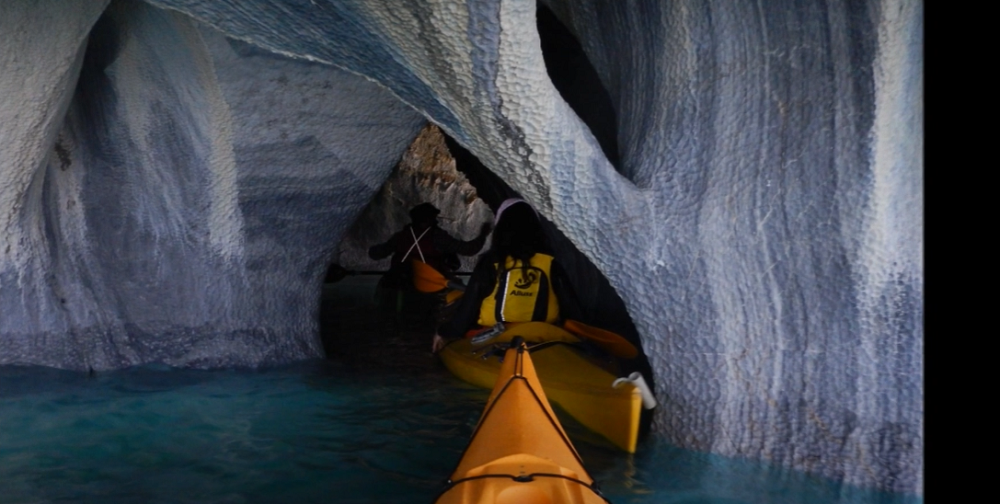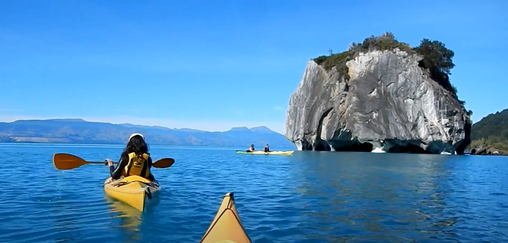 REGULAR GUIDED EXCURSION – The excursion starts from Bahía Mansa which is 4km south of Puerto Tranquilo, and after paddling all the way to the marble formations, the kayaking is along the Marble Cathedral, Caverns and Chapel, an amazing group of small islands of marble rock which have been sculptured during centuries by wind and water from rain and the lake. It is a 3 hours excursion round trip from Puerto Tranquilo and back. It is an easy excursion which can be reserved for any time between 8:30 am and 4:00 pm. It includes a certificated guide, full kayak equipment, first aid and rescue kit. It is not recommended for overweight persons, people with heart problems and people who have had a recent injury. Available for children 8 years or older with an adult. Subject to change due to weather conditions.