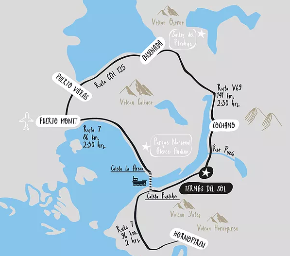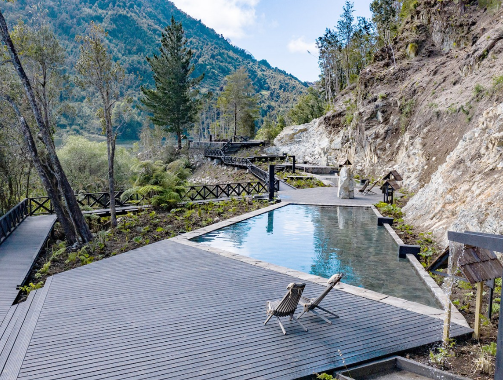 The hot springs “Termas del Sol” are in a wetland environment, on the shores of a lake, next to a rocky wall and submerged in the temperate rain forest. The facilities have 10 stone thermal pools whose temperatures vary between 36 ° and 45 ° Celsius, each one of them offers an exceptional view of the environment. The hot springs also offer a cafeteria, bathrooms and dressing rooms with individual lockers and a convention room. The hot springs work between 10 in the morning and 8 at night and we highly recommend arriving early or making use of them at the end of the day as they receive many people. You cannot make a prior reservation and the entrance fee is aprox US$ 30 per person. You must bring your own towel.