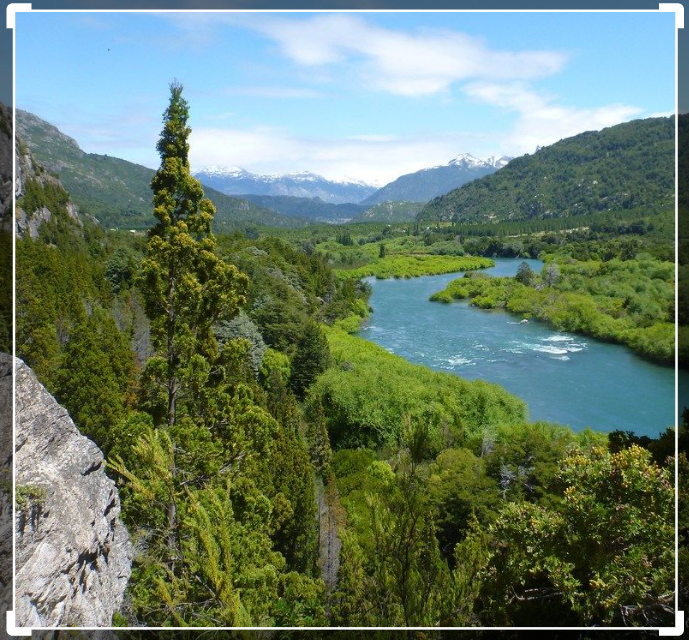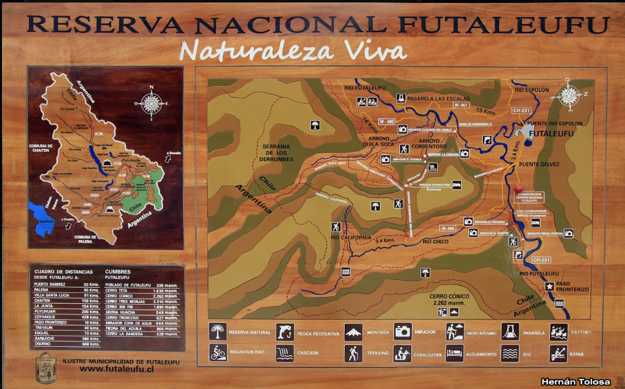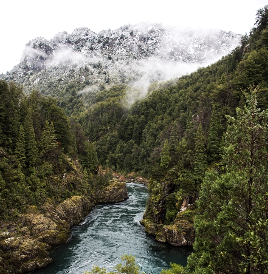 The Futaleufú National Reserve has an area of 12.000 and more hectares, was created in 1998, and is located along the border with Argentina, south of the Futaleufú river – big river in Mapudungun. The main mountain landmark is the Cerro Cónico. The reserve was created to protect the Ciprés de la Cordillera (Mountain Cypress) and the Huemul (Andean Dear), both in danger of extinction. The surroundings are of great beauty, the big and fast flowing, turquese water river descends among rugged and rocky mountains and snowed peaks. The Futaleufú National Reserve is part of the Biosphere Reserve of the Temperate Rainforest of the Southern Andes