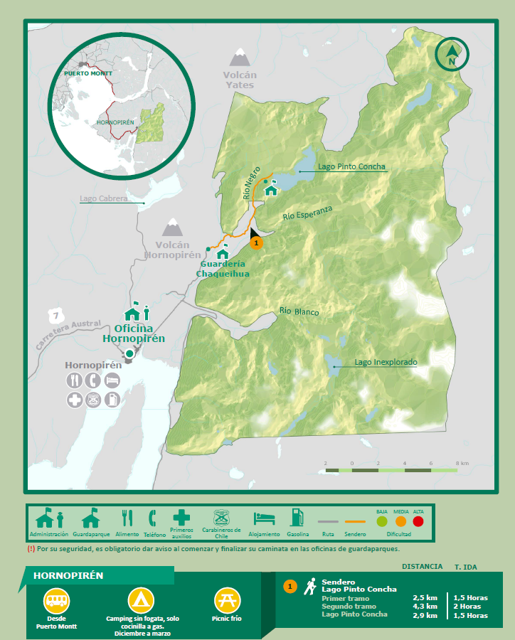 The Hornopirén National Park – snow oven in Mapudungun - is part of the Biosphere Reserve of the Temperate Rainforest of the Southern Andes. Almost half of the park area is covered by native forest of thousand years old Alerce Trees, Ulmos, Coigues, Tepas and Luma Trees. The rest is rocky and rugged landscape, snow topped mountains, lakes, and glaciers. Even though the Hornopirén Volcano is not within the park, it is still an important landmark of the region. The entrance to the park is at Chiquihua Alto area. It is also possible to visit Cabrera Lake. The park has very few visitors.
